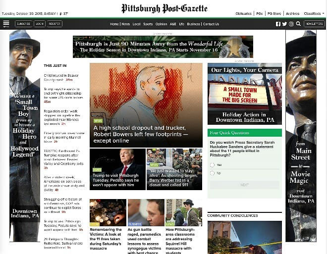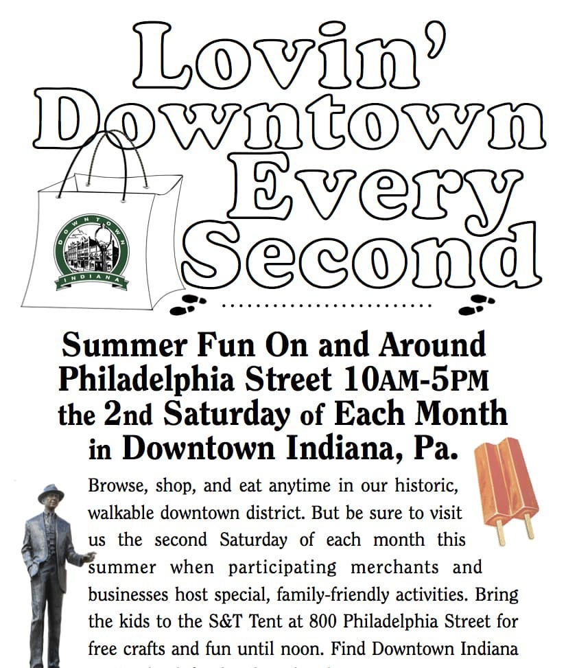 Below, a four-banner entry in the Pittsburgh Post-Gazette's 2018 Campaign for a Cause program, detail from a Lovin' Downtown Every Second flyer, a two-sided business directory, and an event partnership announcement.